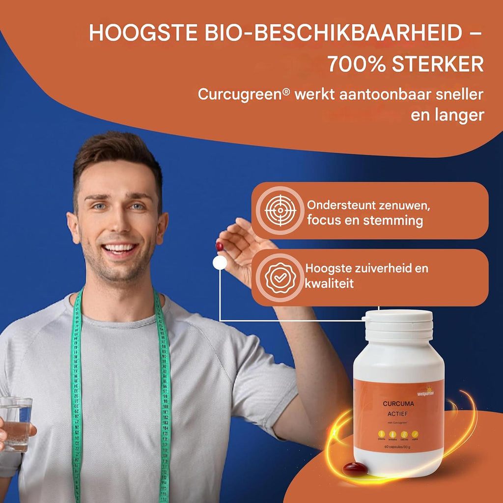 Ontdek de kracht van natuurlijke ontstekingsremming en celbescherming met Wellpursan Curcuma Active. Deze premium kurkuma-capsules bevatten het gepatenteerde BCM-95® curcumine-extract, dat tot 7 keer beter opneembaar is dan standaard curcumineformules. Perfect voor wie het beste uit natuurlijke supplementen wil halen – zonder kunstmatige toevoegingen.