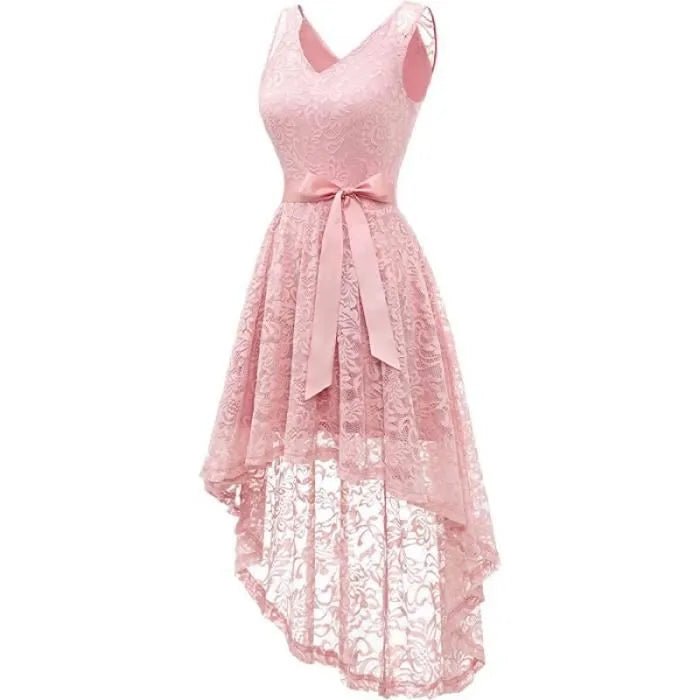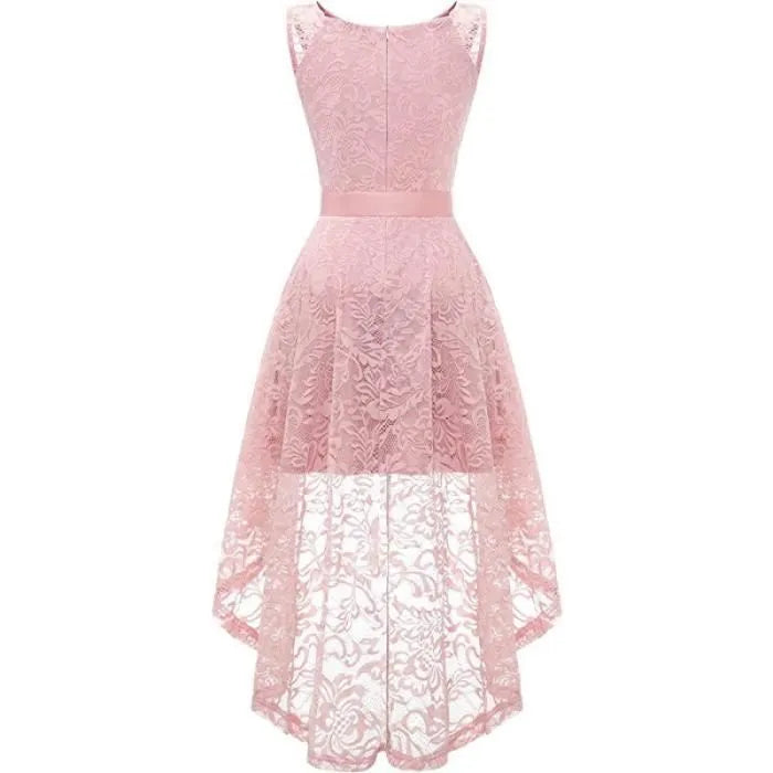 Deze elegante roze cocktailjurk combineert verfijning en comfort in één. De jurk is gemaakt van zacht, rekbaar kant met een gladde polyester voering en biedt een slim gesneden taille die prachtig overloopt in een licht uitlopende rok. De hoog-laag zoom geeft een speelse en feestelijke uitstraling, perfect voor speciale gelegenheden. Dankzij de verborgen ritssluiting aan de achterkant sluit de jurk mooi aan, terwijl de verwijderbare strikceintuur zorgt voor een veelzijdige stylingoptie.