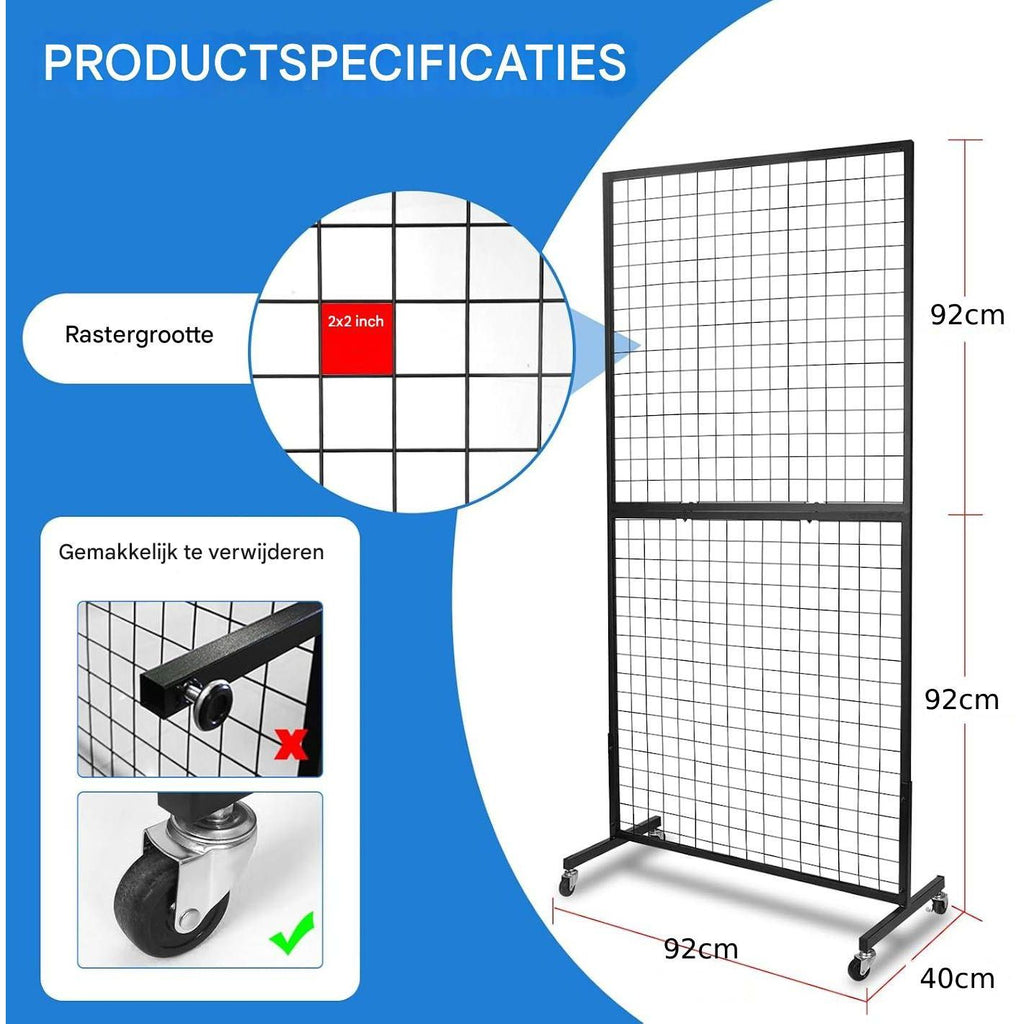 Presenteer je producten, kunstwerken of accessoires professioneel met dit stevige metalen gridwall displayrek. Perfect voor gebruik in retailwinkels, marktkramen, kunstshows of ambachtelijke beurzen. Dankzij het sterke frame, de stabiele basis en de soepele wielen is dit rek zowel duurzaam als praktisch in gebruik.