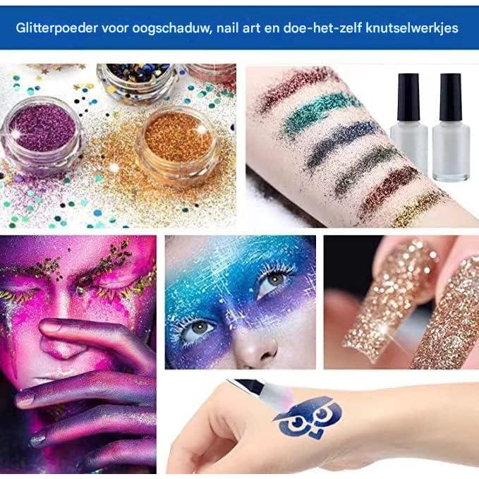 Kleur glitter: gemengd – metallic, neon, pastel en holografisch