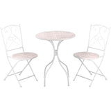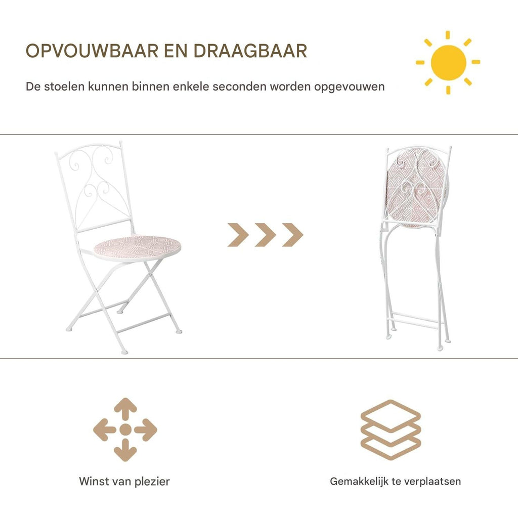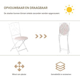 Geef je tuin, balkon of terras een elegante en rustieke uitstraling met de Outsunny 3-delige tuinset van Outsunny. Het mozaïek tafelblad en de sierlijke patronen in het metaalwerk geven deze set een charmante mediterrane look. De ronde tafel en de twee inklapbare stoelen zijn gemaakt van robuust metaal en keramische tegels, perfect geschikt voor buitengebruik. Dankzij het compacte en opvouwbare ontwerp is deze set ideaal voor kleinere buitenruimtes en eenvoudig op te bergen.
