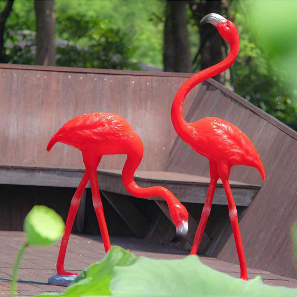 Dit tuinbeeld toont een sierlijke flamingo in neerkijkende houding, die een natuurlijke en rustgevende sfeer toevoegt aan je buitenruimte. Ideaal als accent bij vijvers, bloemperken of terrassen. -