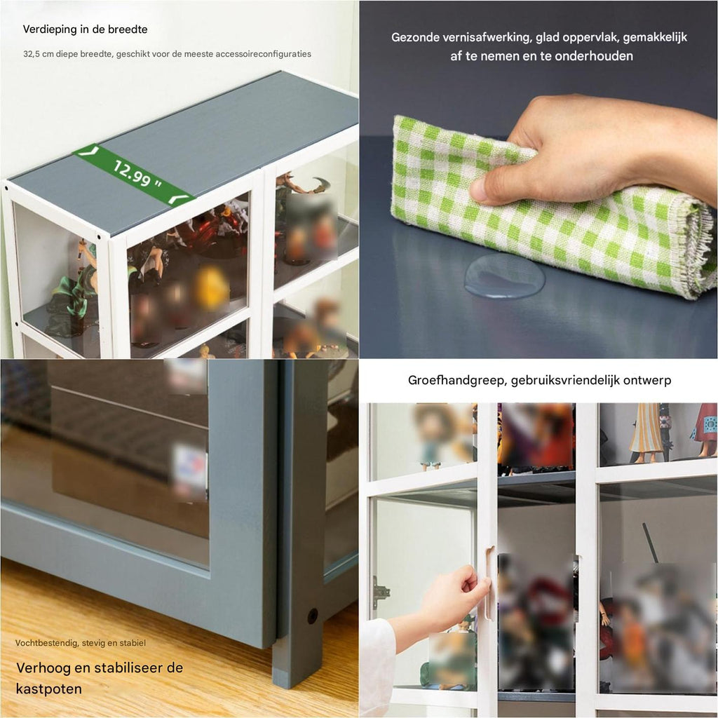 De kast is ontworpen om je collectie veilig, overzichtelijk en stofvrij te presenteren — ideaal voor figuren, miniaturen, modelauto’s, trofeeën of kunstobjecten.