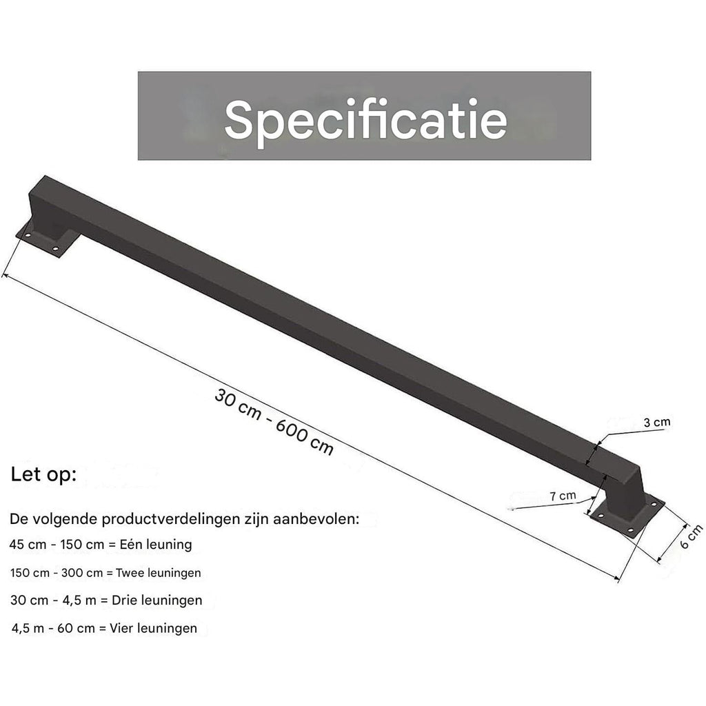 De vierkante buisstructuur geeft een strak, modern uiterlijk dat perfect past bij industriële of eigentijdse interieurs. Ideaal voor gebruik in woningen, tuinen, balkons, dansstudio’s, lofts of trappenhuizen. De leuning kan horizontaal, verticaal of schuin worden gemonteerd, afhankelijk van jouw ruimte.